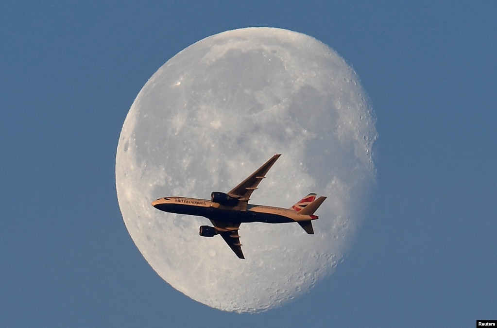 1 យន្តហោះដឹកអ្នកដំណើររបស់អង់គ្លេសមួយគ្រឿងកំពុងហោះហើរនៅពីមុខព្រះចន្ទ នៅពីលើទីក្រុងឡុងដ៍ ប្រទេសអង់គ្លេស។ 2 ស្ត្រី...